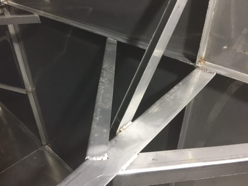 斜拉主要的作用在于分擔主拉筋的拉力,進一步對水箱板進行穩固,切成500mm的長度,連接在水箱與主拉之間。形成龍爪式,常規尺寸為4cm*1cm厚度一般以靠近頂部的側板厚度為基準,連接處必須進行滿焊處理。