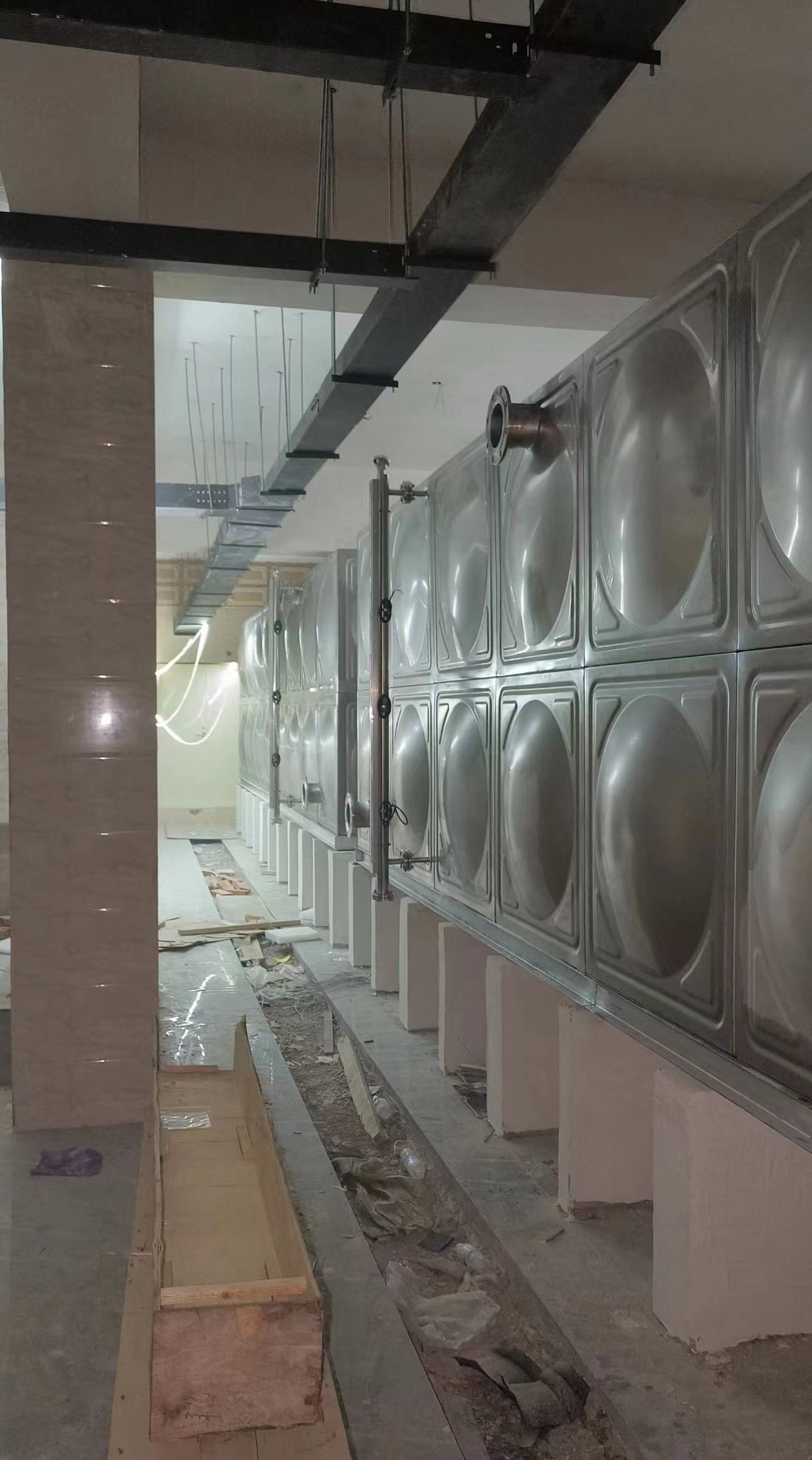 我司承接的河北省唐山市玉田縣潤城府地下室不銹鋼生活水箱項目,已安裝試水完畢。不銹鋼焊接水箱,是指容器本體用不銹鋼板沖壓帶一定凹凸形狀,使之鋼度大大提高,再焊接成薄殼箱體的新型水箱,是目前國內較先進、較美觀、較適用的水箱,其結構精巧、合理、先進,用材省,可在民用及工業建筑中廣泛采用,是儲存、調節用水的理想設備。